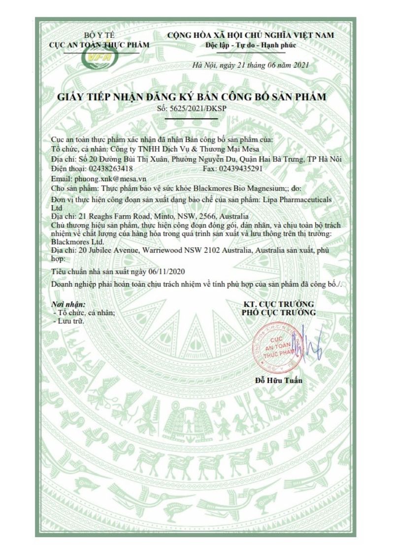 Bản công bố sản phẩm của Bio Magnesium Blackmores